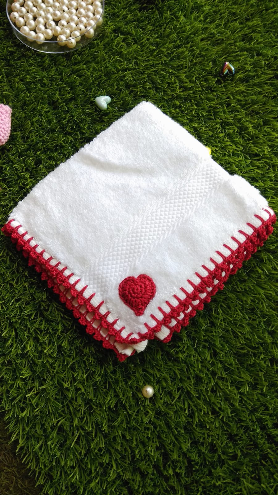 white towel kerchief with red crochet border